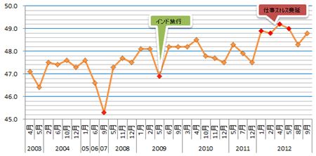 2010年秋、ストレス満載の仕事がめでたく終了後一時期落ち着きましたが、次に就いた仕事がまたもストレス満載で、2012年、人生初の平均値49キロをキープ。