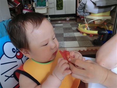 離乳食したドロドロ形状はキライで、みんなの食事の時にパンやご飯粒を食べるのが嬉しいみたい。