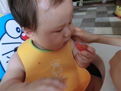 一人で持ちたいらしく、両手でトマトを掴みとろうとする孫ちゃん。