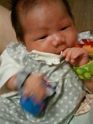 最近、音に反応するので、Sassyのブレスレットを両手につけられてる孫ちゃん。