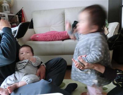 病院以外で同じ年の赤ちゃんと会うのは初めての孫ちゃん。
