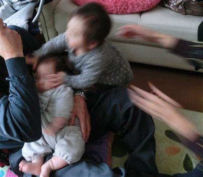 あっという間に孫ちゃんの顔面に両手共々倒れこみ。。。孫ちゃん、大泣き(T_T)