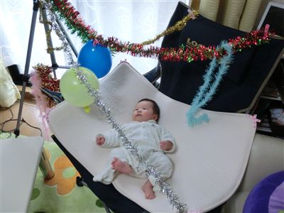 午後、アウトドアチェアに寝せた時には、カメラの三脚からモールと風船を吊るした。