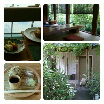 お蕎麦のお店は、日本庭園風の緑を眺めながらの和の雰囲気で、