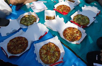 走り終わったあとは、宅配ピザポケットで芝生ランチ。走った後のPIZZA、美味しい