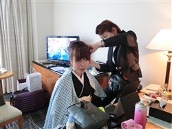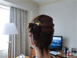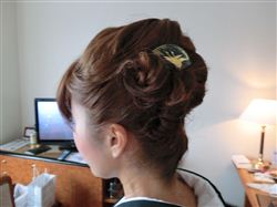 こんなに派手にならないように、髪は散らさないで頭の横上にボリュームをもたせてくださいって言うと、「後はまかせてください」という事で。