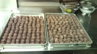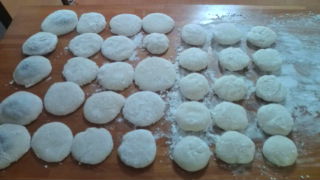 上手にちぎらないとお餅がきれいに丸くならないけどおかみさんは上手にちぎる。