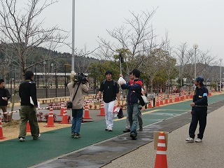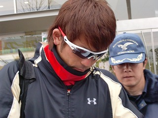 多目的グラウンドへの選手移動道路でご飯食べてたら、取材人に囲まれて誰か来た。