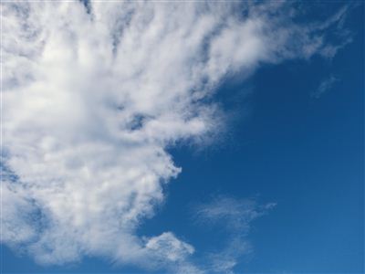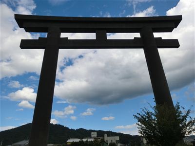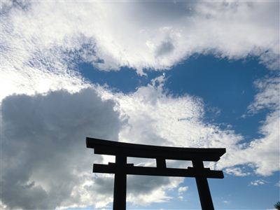 参拝が終わって大鳥居を仰いだら、大鳥居の後ろに真っ青な空と真っ白な雲。