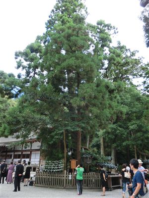 三輪山に降りた神様、大物主大神(おおものぬしのおおかみ)の化身の白蛇が棲むと名付けられたご神木。蛇の好物の卵がお供えされてます。