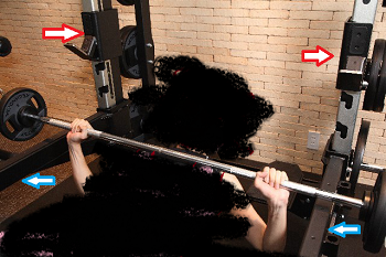 でもベンチプレス用のマシンはバーベルを置く(赤矢印)部品がやたら出っ張ってるから、上げたとき当たりそうで邪魔。