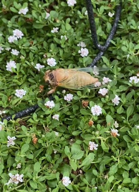 最初、夕方18時頃、ウッドデッキの上だから何?この虫?って思ったけど(セミは木にいるものと思ってた)見たことあるような・・あーセミの抜け殻に似てる。でも、色が濃くて(透きとおてない、当たり前だ、中に本体いるから、笑)
