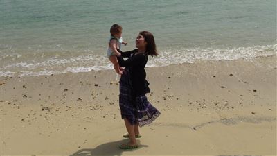 初めて見る海 ちょっと怖い?腕をしっかりまわして服を掴んでた。