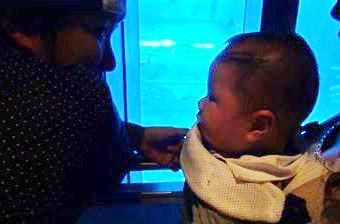 青い水槽と中で泳ぐカラフルな魚に興味を持ったのか、孫ちゃんは手足バタバタさせて大はしゃぎ。