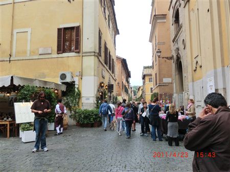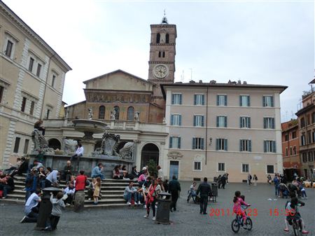 ソンニーノ広場から、お店が並ぶ賑やかな通りを歩けばS.M. イン・トラステヴェレ広場です。