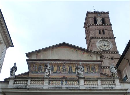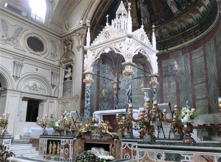 9世紀にできた後陣のビザンチン風モザイクと、ステファノ・マデルノによって造らられた大理石の聖女チェチリア像。モザイクにはチェチリアや彼女の夫が描かれてます。