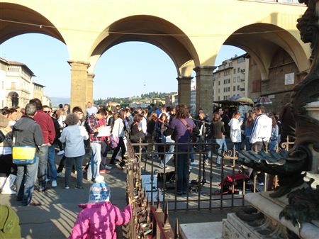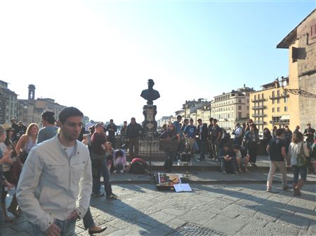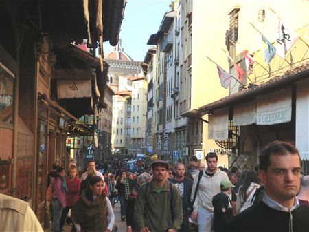 13世紀頃までは橋の上でなめし革屋や肉屋が並び異臭を放ってたのですが、自分が住むピッティ宮殿の近くに臭い市場があることを嫌ったメディチさんが市場を撤去してこキレイな宝石店が並ぶ通りにしました。