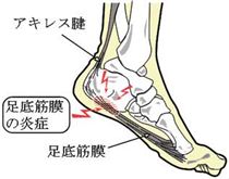 ”足底筋膜”とはかかとから5本の指の付け根にかけて足底に広がる薄い膜状の筋膜。この筋膜の踵骨(かかとの骨)とつながっている近辺に炎症が起こると、踵、あるいは足底部分に痛みを感じます。
