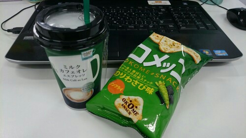 お土産のおやつがないから、オフィスグリコとコンビニコーヒー。
